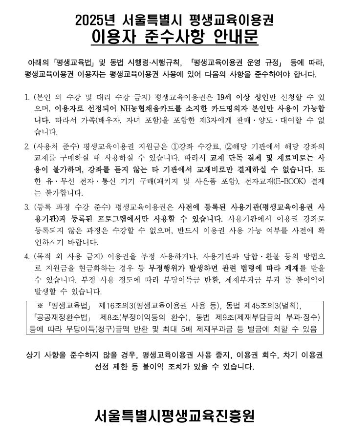 2025년 서울특별시 평생교육이용권 이용자 준수사항 안내문